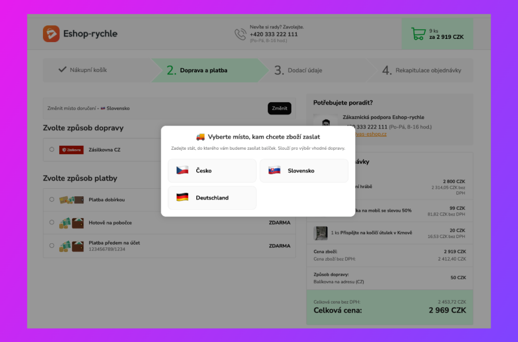 - Relevantní nabídka: Dopravy vždy odpovídají realitě pro daný stát, což zvyšuje důvěryhodnost e-shopu.