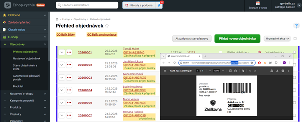Dalším cílem integrace je, aby vás odesílání balíků nezdržovalo. Přímo z administrace Eshop-rychle tak díky GO balíku zvládnete: