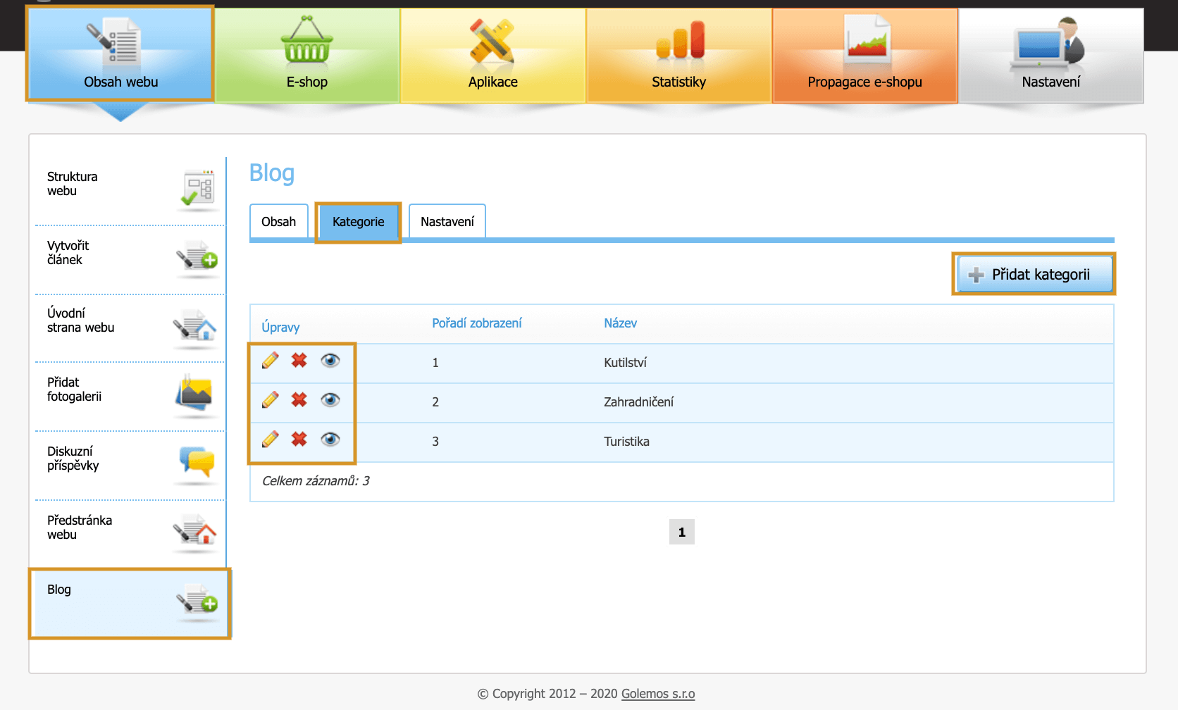 V administraci e-shopu zvolíte kartu “Obsah webu” → “Blog” → “Kategorie” (Obr. 6).