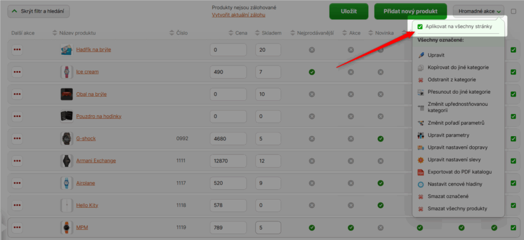✅ Hromadné úpravy produktů lze provádět na všech (třeba i pečlivě vyfiltrovaných) stránkách najednou.
