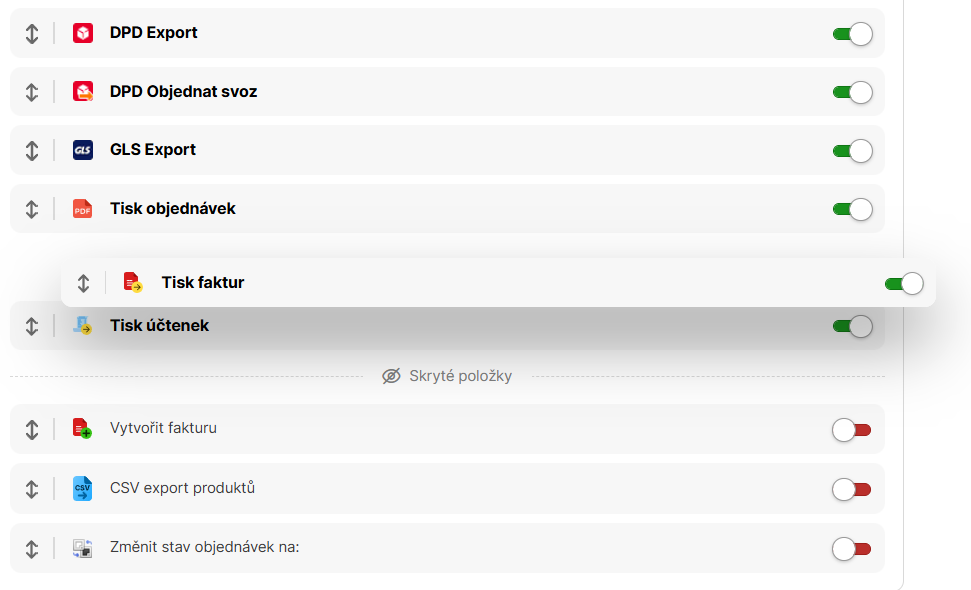 Nově si můžete v administraci sami nastavit, které hromadné akce chcete v nabídce u objednávek vidět, a ty nepotřebné jednoduše skrýt. A to není všechno! Nejpoužívanější akce si navíc můžete libovolně a snadno seřadit tak, abyste je měli vždy pěkně po ruce.
