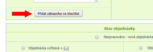 Uživatele lze na blacklist přidat v detailu došlé objednávky a to konkrétně ve spodní části objednávky pod informacemi o zákazníkovi. Zde se nachází tlačítko pro vložení uživatele na blacklist.