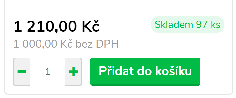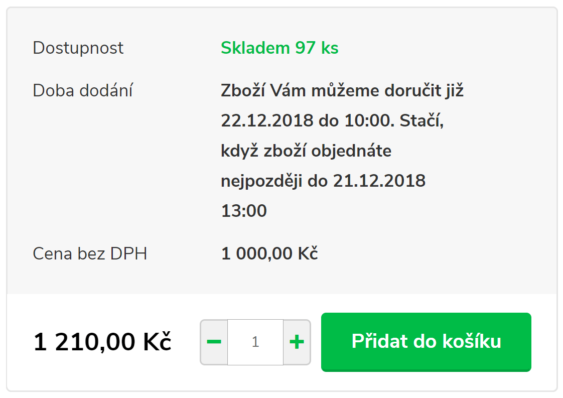 - Vlastní dostupnost v boxu produktu – Vlastní zadaná dostupnost skrze číselník dostupnosti se zobrazuje v boxu produktu a přepisuje tak defaultní hodnoty Skladem ano / skladem ne.