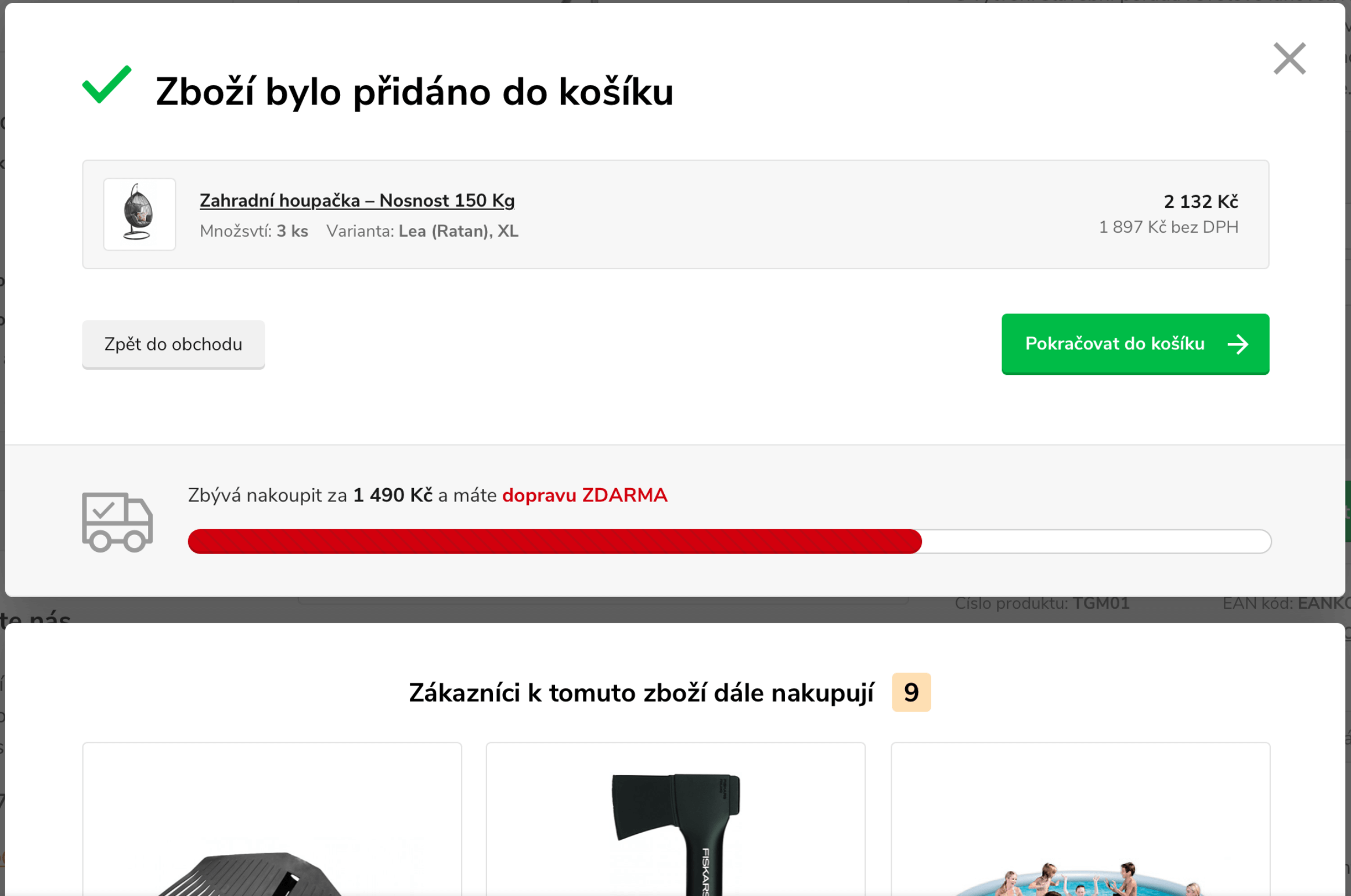 - Popup při zakoupení produktu – Při vložení do košíku je automaticky zobrazeno popup okno, které informuje o vložení produktu do košíku a případném odpočtu / získání dopravy zdarma. Pod tímto oknem je také možno zobrazit produktový box s připojenými produkty.