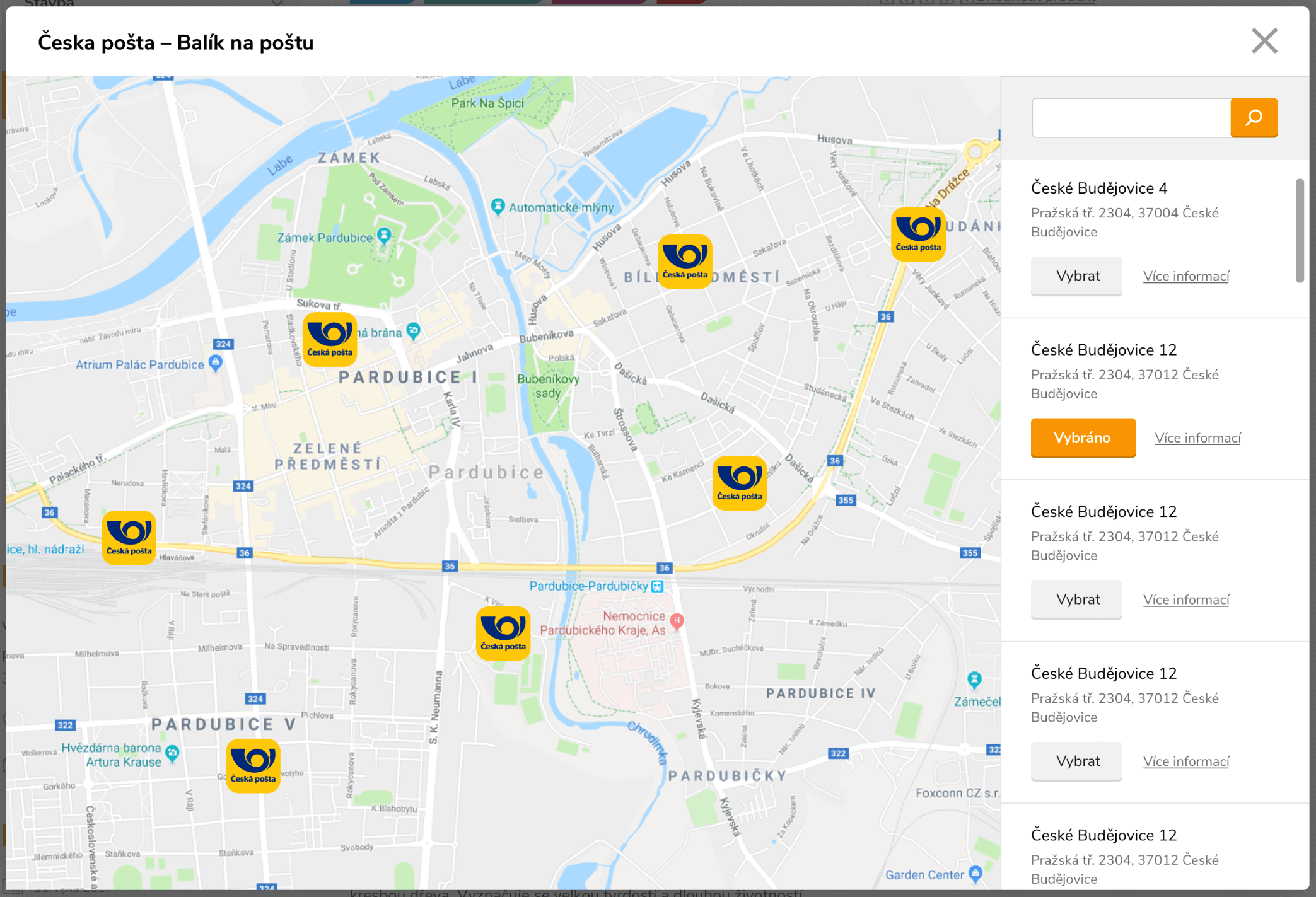 - Volba dopravy na pobočku – Pokud máte v systému aktivní možnost zaslání objednávky na pobočku dopravce, jistě vy i vaši zákazníci uvítáte moderní zobrazení výpisu poboček na mapě a to ihned po výběru dané dopravy (nikoliv až po přechodu na další krok košíku).Součástí tohoto modulu je pak i automatická volba nejbližší pobočky, pokud má zákazník v prohlížeči zapnutou lokalizaci.