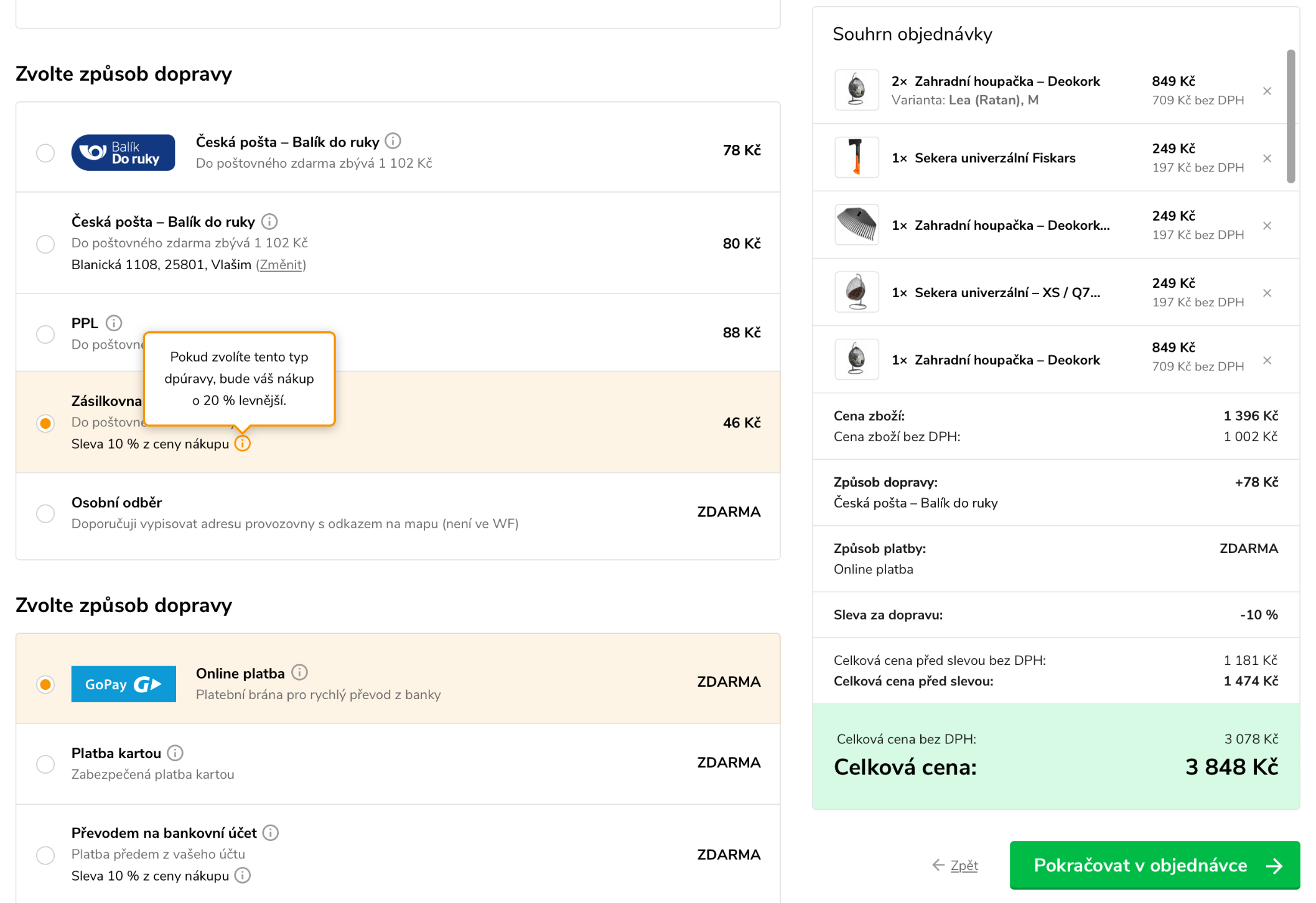 - Rekapitulace objednávky vždy po ruce – Od druhého kroku objednávkového procesu je součástí všech kroků i rekapitulace objednávky, kde uživatel stále vidí přehled zboží, které objednává a celkovou cenu objednávky včetně všech příplatkových hodnot (například poštovné).