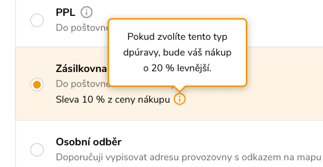 - Popisek poštovného – U každé možnosti dopravy a platby lze zadat viditelný popisek poštovného, který se zobrazí ihned při jeho volbě a dále dodatečný popisek, který se zobrazí po najetí kurzoru na otazníček.