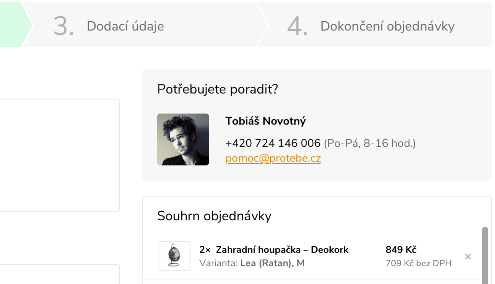 - Kontaktní box v objednávkovém procesu – nad rekapitulací objednávky je možné aktivovat zobrazení kontaktního boxu (Nastavení – Nastavení webu – Nastavení zobrazení) pro ještě nižší míru nedokončených objednávek. Zákazník bude vždy vědět, že jste mu k ruce.