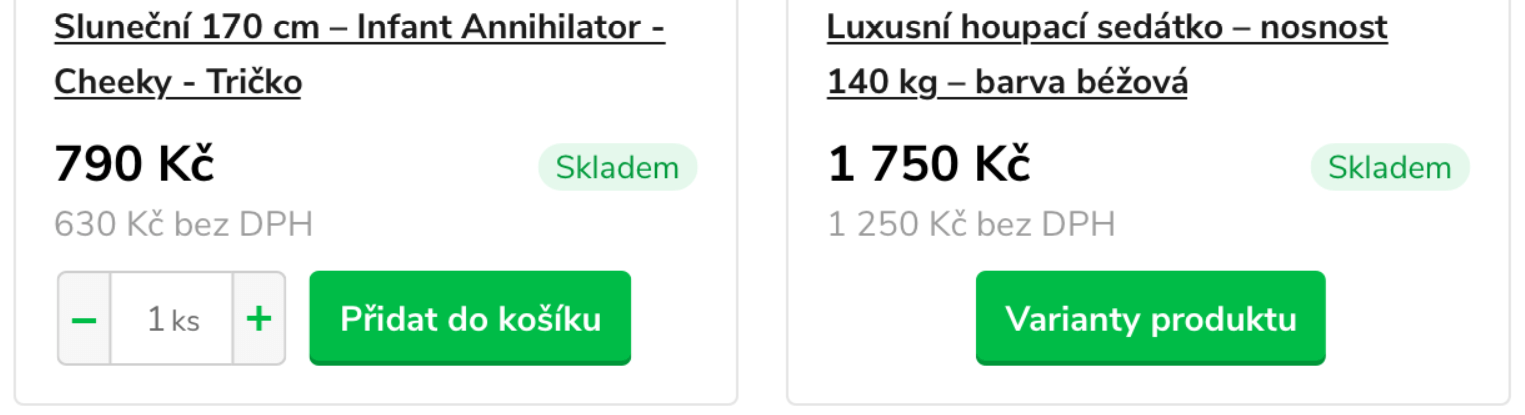- Zakoupení produktu s variantou – Pokud má produkt varianty, není možné jej objednat z výpisu produktů. Namísto toho je v boxu zobrazeno tlačítko pro volbu variant, který uživatele přesměruje do detailu produktu, kde musí varianty zvolit. Pokud nezvolí variantu, varovná hláška mu nedovolí produkt zakoupit.
