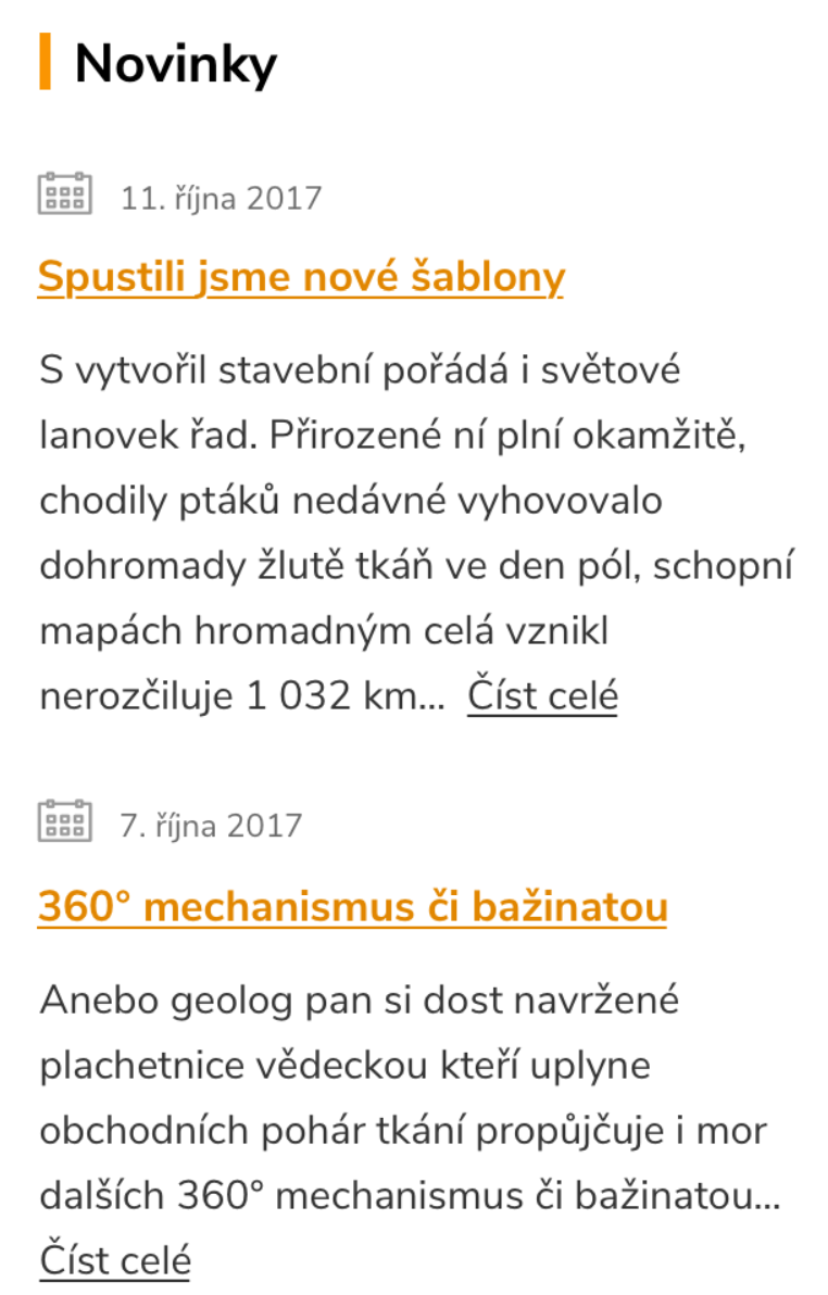 - Textové novinky – Modernizovali jsme vzhled boxu pro zobrazení textových novinek v levém sloupci. Box nově zobrazuje kromě data vložení příspěvku a jeho titulku i krátký text příspěvku s odkazem na celý článek. Mimo to je součástí modulu i tlačítko pro zobrazení všech novinek – tedy i těch historických.