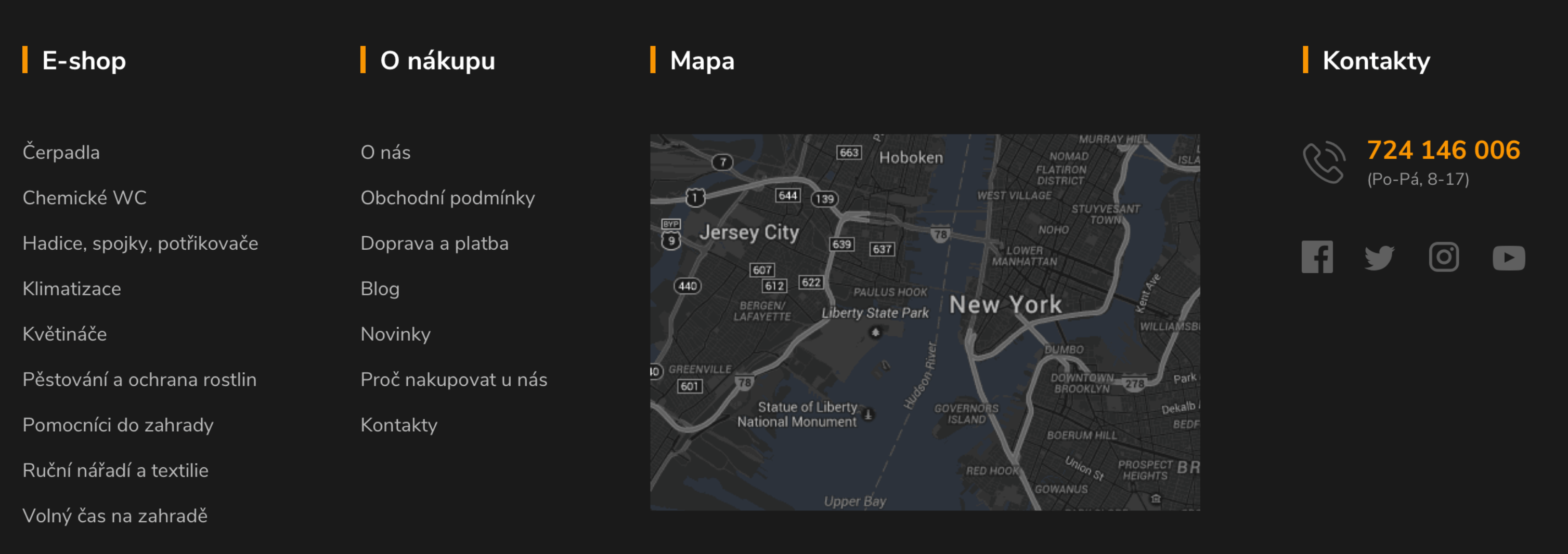 - Patička – Šablona New York obsahuje jednoduchý modul pro úpravu patičky. Tu lze nastavit ve čtyřech sloupcích, z nichž první tři mohou obsahovat vlastní obsah upravitelný přes editor (Obsah webu – Struktura menu – Patička) a čtvrtý strukturované kontaktní informace (Nastavení – Nastavení webu – Nastavení zobrazení).