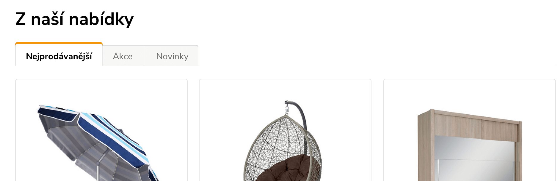 - Zobrazení produktů na úvodní straně – Zobrazujete nové produkty na úvodní straně? Poté jistě vy a především vaší zákazníci uvítáte nový modul pro záložkové zobrazení jednotlivých produktů, které jsou na úvodní straně zobrazeny.Modul automaticky třídí vložené produkty do záložek Nejprodávanější, Akce, Novinky, pokud mají aktivní v jejich nastavení tento příznak a nebo do záložky „Vybrali jsme pro vás“, pokud jsou bez příznaku. Má-li produkt více příznaků, je zařazen do nejvíce prioritní záložky (Nejprodávanější → Akce → Novinky).