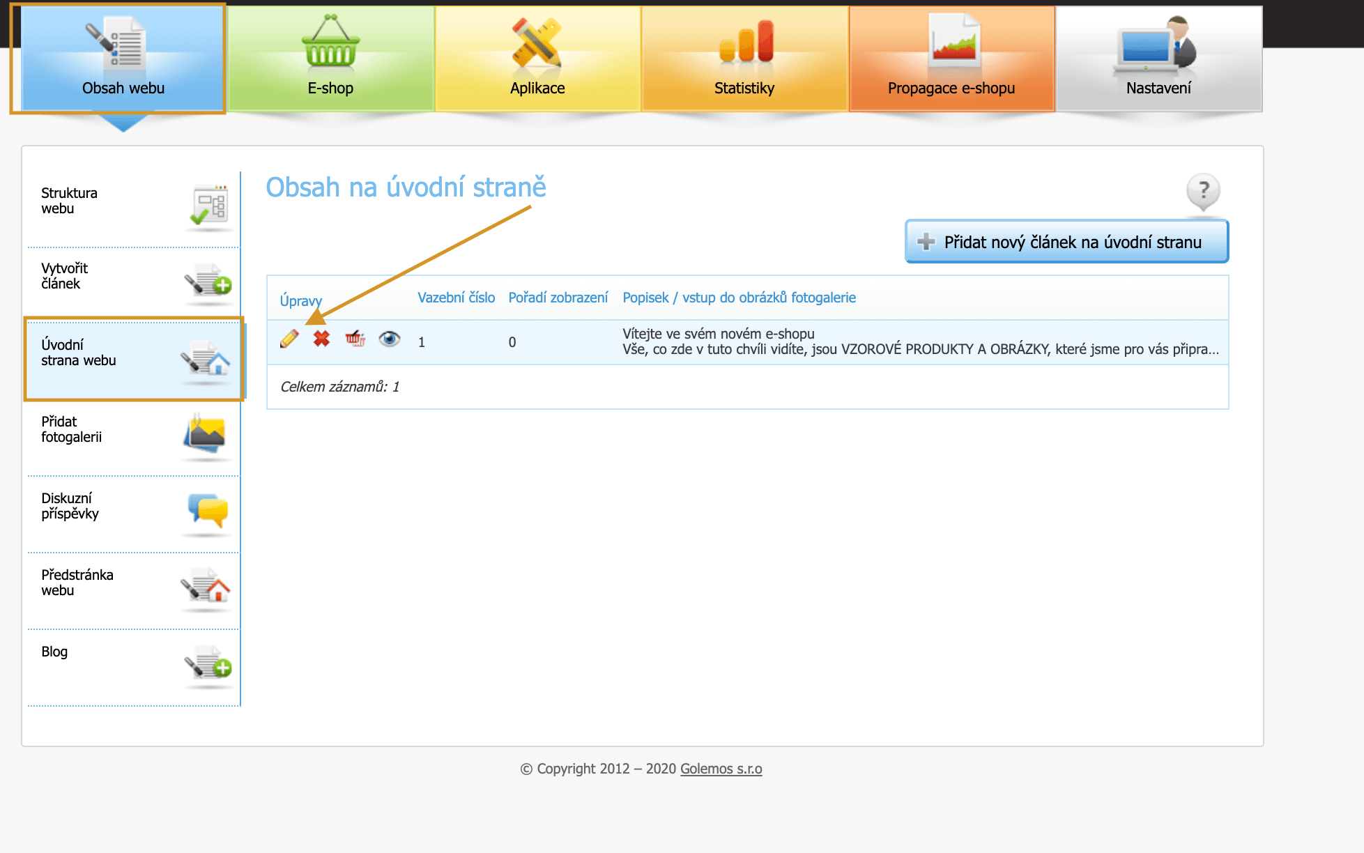 V administraci e-shopu zvolíte kartu “Obsah webu” → “Úvodní strana webu” (Obr. 2 a 3).