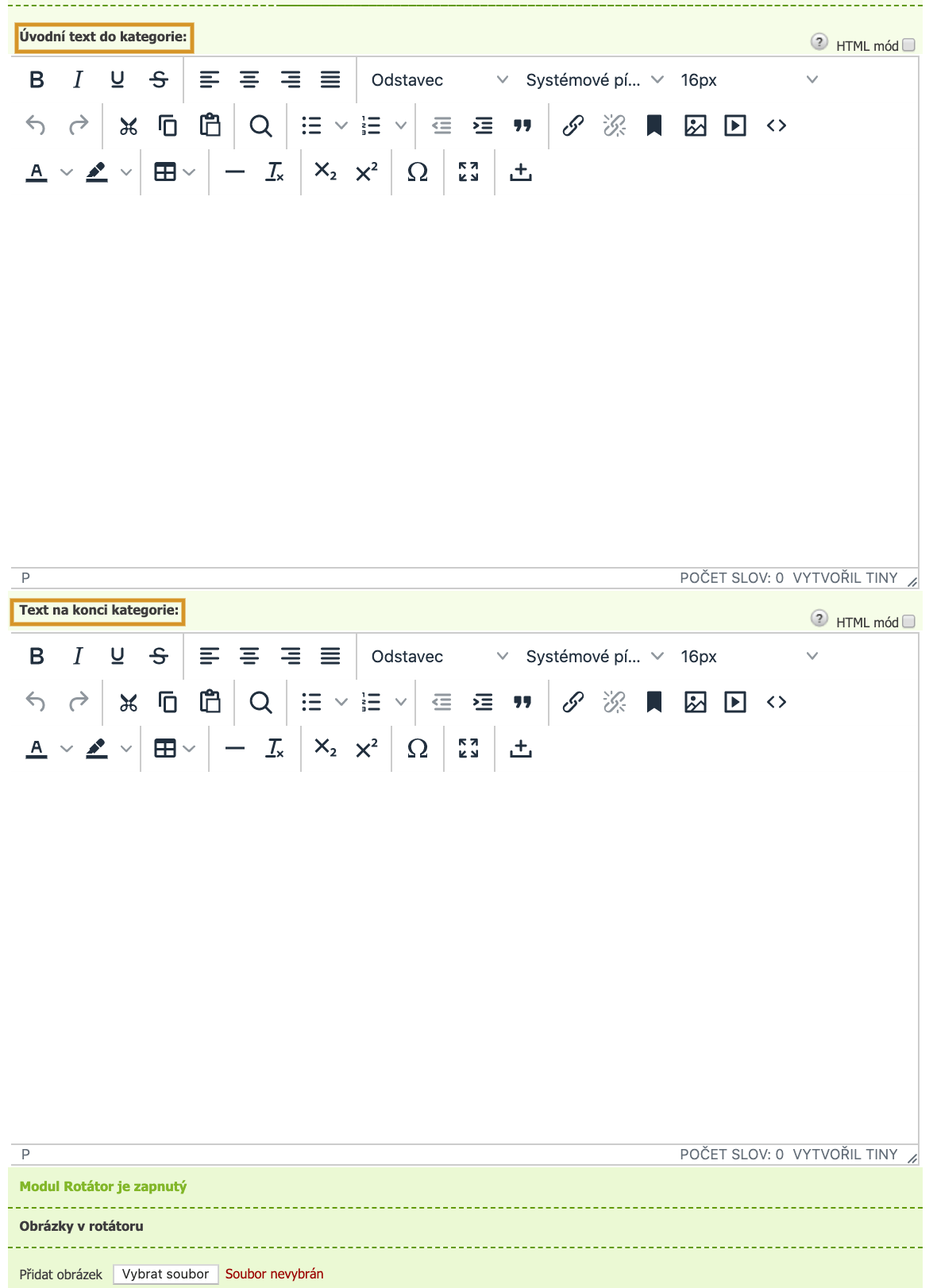 - Má obdobnou funkci jako úvodní text kategorie. Pro popisy ho používejte jen za předpokladu, že jsou opravdu dlouhé. Jeho méně důležitou část můžete propsat do textu na konci kategorie, v úvodní části bude to nejdůležitější. Celý text nebude v úvodu příliš dlouhý a neposune zbytečně produkty z viditelné části stránky dolů.