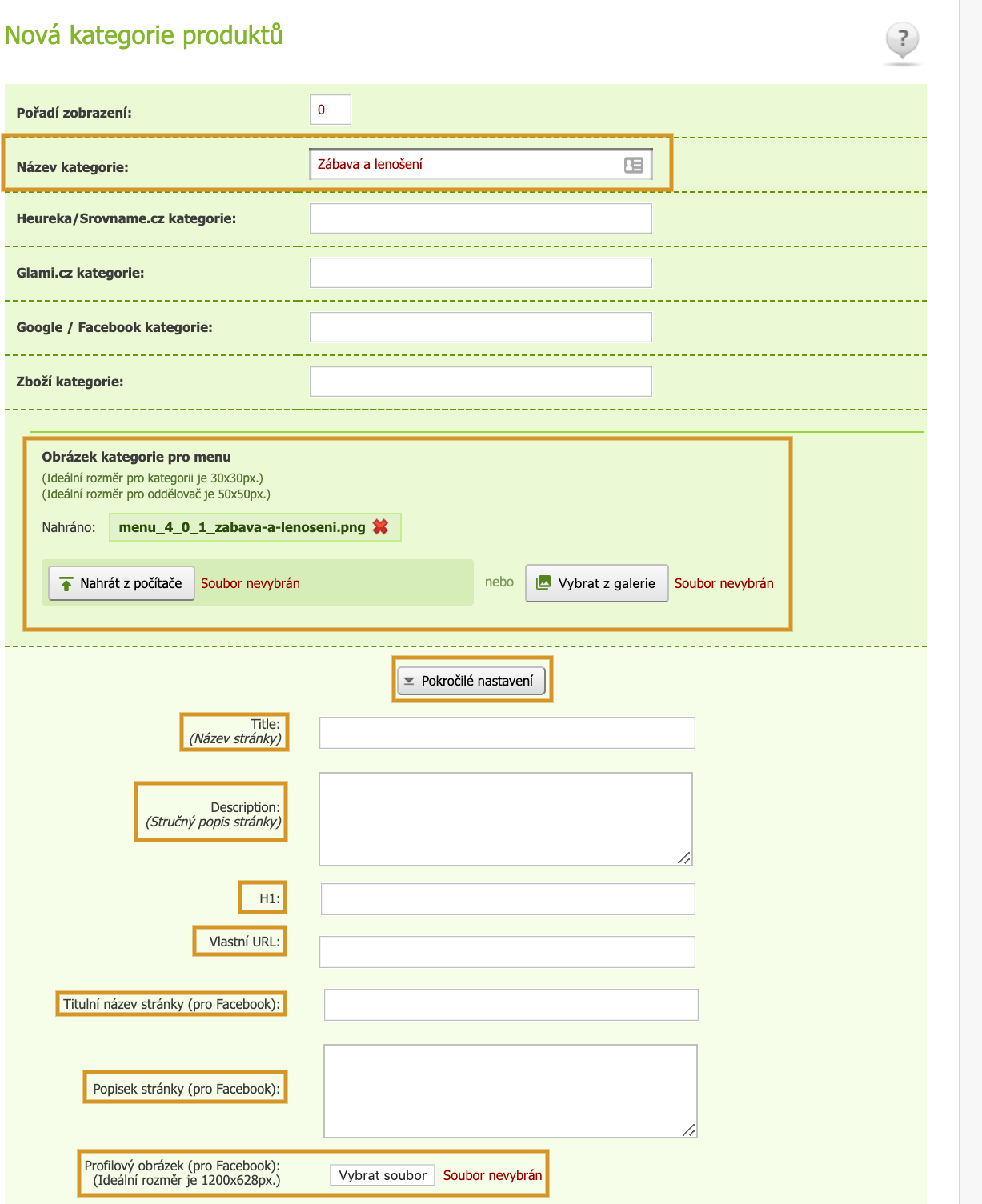 Název kategorie (text odkazu v menu): Podkategorie mají často delší název (např. “Zahradní dřevěný nábytek”). Z tohoto důvodu bychom měli do kolonky “Název kategorie” uvést kratší název (pouze “Dřevěný”). Je to důležité pro zachování přehlednosti menu pro návštěvníky.