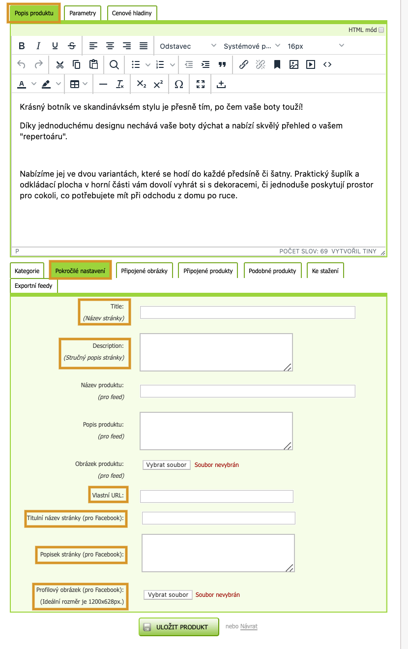 - Pokročilé nastavení: Jedná se o stejný princip jako u kategorií. Produktů může být opravdu mnoho, proto nastavení vyplňujte ručně jen u důležitých produktů.