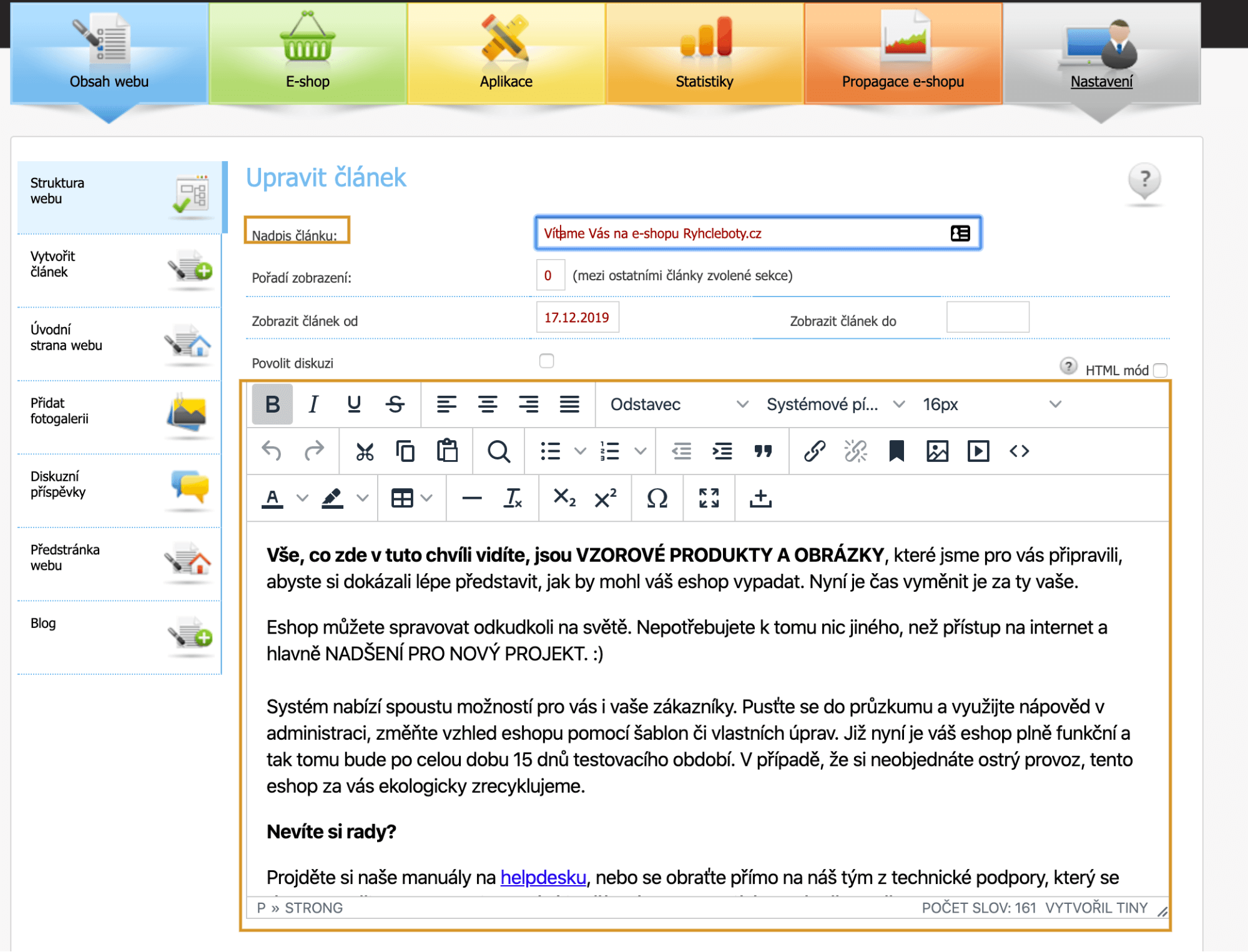 - Nadpis článku se propisuje jako hlavní nadpis (H1) úvodní stránky e-shopu.
