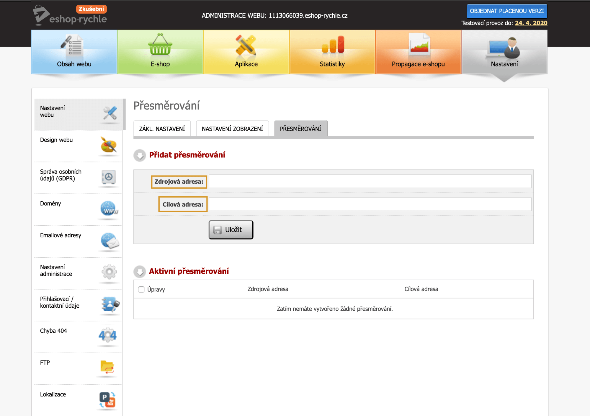 V administraci e-shopu zvolíte kartu “Nastavení” → “Nastavení webu” → “Přesměrování” (Obr. 11).