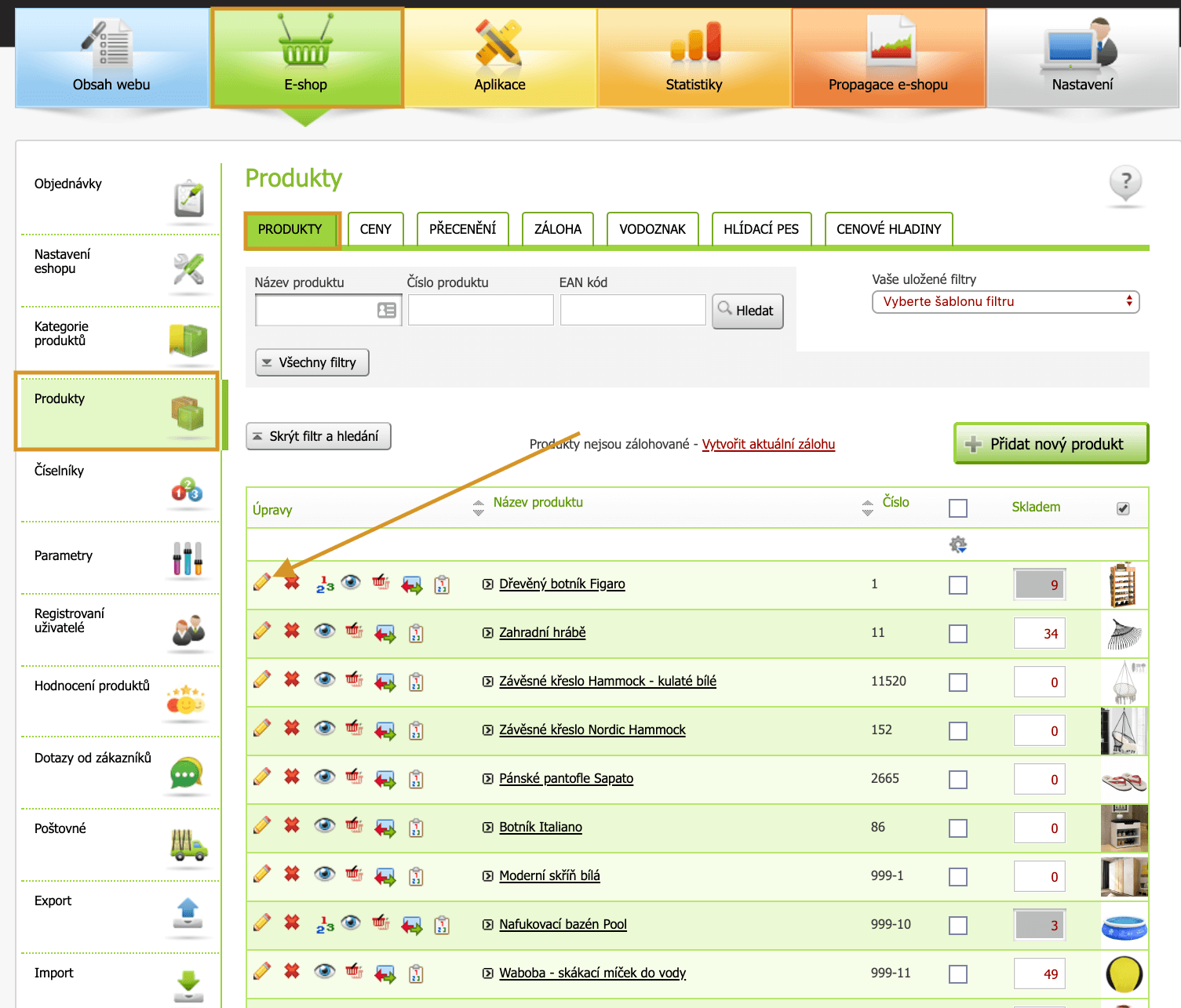 Produkty najdeme v založce E-shop → Produkty → Produkty → Tužka (Obr. 7).