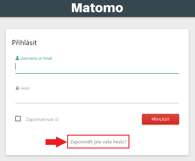 Před prvním vstupem do statistik, je potřeba na logovací stránce do rozhraní Matomo zažádat o zapomenuté heslo a to na přihlašovací e-mail. Ten je shodný s přihlašovacím e-mailem do administrace eshopu.